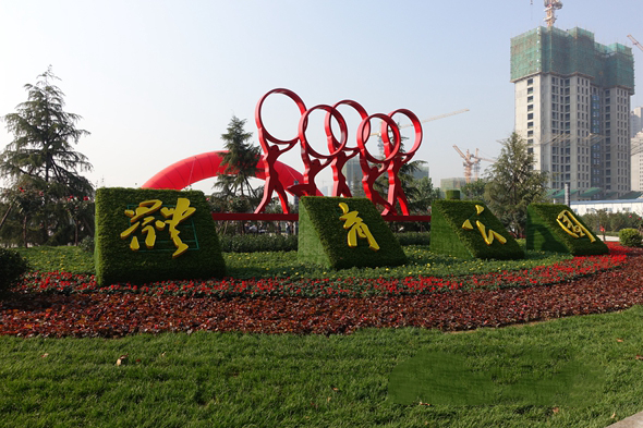 国庆期间,石家庄体育公园内进行了大规模的节日摆花。公园主入口五环雕塑周边用四季海棠、万寿菊、矮牵牛、天门冬等品种花卉搭配形成自然式花带,五彩缤纷。进入公园,7个花卉景观柱同样引人注目,园区内主要道路也摆上了颜色不同的花卉,孔雀草、一串红、非洲凤仙等婉如绕在道路两侧的丝带。