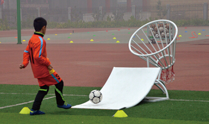 参观结束后,嘉宾们来到室外足球场,现场观看了孩子们的足球训练课程,并与他们进行了交流与互动。多孔射门、头顶进框、足球爬坡……丰富多彩的足球训练游戏以及造型新颖、趣味性十足的训练器械引起了到场嘉宾们的广泛关注。据于丽娜介绍,这些造型特别的足球训练器械来自河北晟大华健体育器材有限公司,自打投入足球课使用后,就深受学生们的喜爱。“这些器材的使用范围非常广泛,不论是在专业足球训练中还是对于没有足球基础的孩子都可以使用。就拿多孔射门这个器材来说,没有基础的孩子可以把它当作足球训练墙,练习脚法,培养足球兴趣。而有点基础的孩子则可以根据自己不同的水平选择不同的孔洞进行射门,提高技术。”通过游戏提高孩子们的足球技术,别具一格的教球方式让孩子们在运动中充满了快乐,阵阵笑声在操场上空回荡。现场一名小球员告诉记者:“我踢足球一年多了,还是第一次见到足球可以这么踢,真的太有趣了!这个迷你球门我都能搬动,占得地方也很小,现在我们想踢个足球比赛随时都可以,可方便了。”