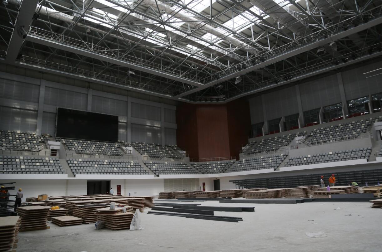进入体育馆后,记者看到施工工人正在铺设活动木地板。现场负责人介绍说:“在木地板检测认证合格后,我们将拆除木地板,进行冰场浇冰,以保证7月底在此举办申冬奥成功两周年冰雪庆祝活动。”