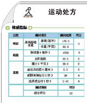 谭京京说,体质测定只是简单评估一个人基本素质水平,“从这些指标里可以看出来人的一些运动习惯或中间出现的一些问题,但如果想给一个人出具一个有指导意义的运动处方,这个测试还是远远不够的。另外评价报告里最后有一个简单的运动建议,算不上运动处方,具体要怎么练,每天练多久,这个还是个性化的东西,需要更为精确复杂的测定。”