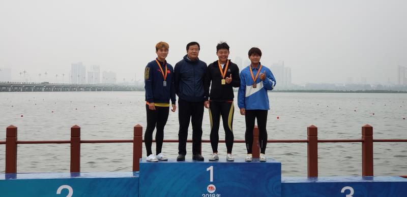 水上运动管理中心主任刘钢(左二)与200米女子单人划艇获奖选手合影留念,左三冠军为我省运动员张璐琦