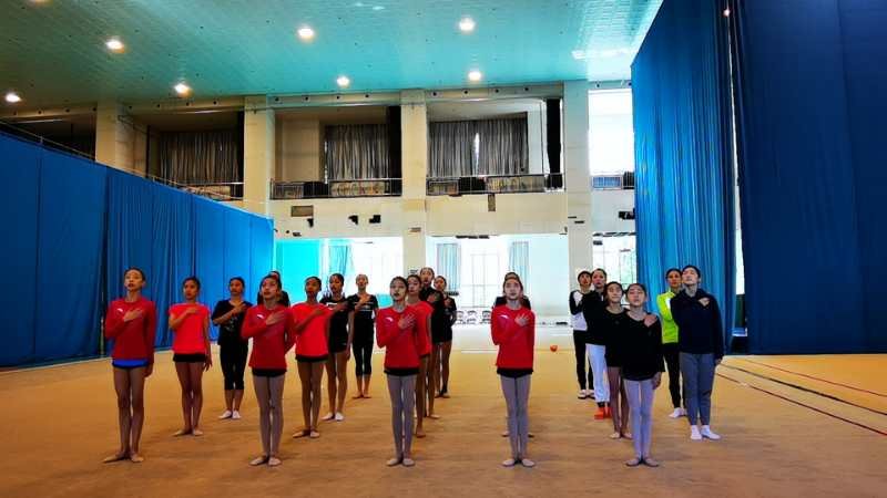 第一批返程运动员隔离结束后走进训练馆组织奏唱国歌仪式