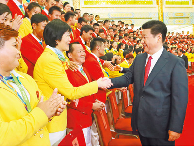 习近平强调,我国体育健儿在里约奥运会上的出色表现,生动诠释了奥林匹克精神和中华体育精神,为祖国争了光,为民族争了气,为奥运增了辉,为人生添了彩,激发了全国人民的爱国热情和全世界中华儿女的民族自豪感,增强了中华民族的凝聚力、向心力、自信心,是中国精神的一个重要体现。