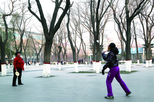 每到下午,长安公园内就聚满了前来锻炼的市民,踢毽子、抖空竹、跳广场舞,在浓厚的健身氛围中,大家玩的不亦乐乎。其中玩法独特的板羽球不时吸引着路人的驻足围观。板羽球的拍子与乒乓球拍的形状相似,不同的是要比乒乓球拍略大一些,没有橡胶;球相对羽毛球来说略小,是用三根羽毛插入一个橡皮套组合而成,形状类似于毽子。“板羽球的打法类似羽毛球,不过没有羽毛球的运动强度那么大,它的要点就是让球尽量保持在空中而不落地。”有近3年打球经验的45岁板羽球爱好者王先生告诉记者,“这个运动主要还是考验和搭档的配合,所以运动量也可大可小,任由运动者自己调节,所以是一种非常适合中老年人的健身运动。”