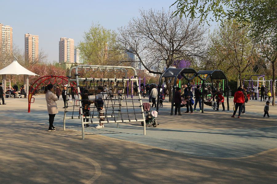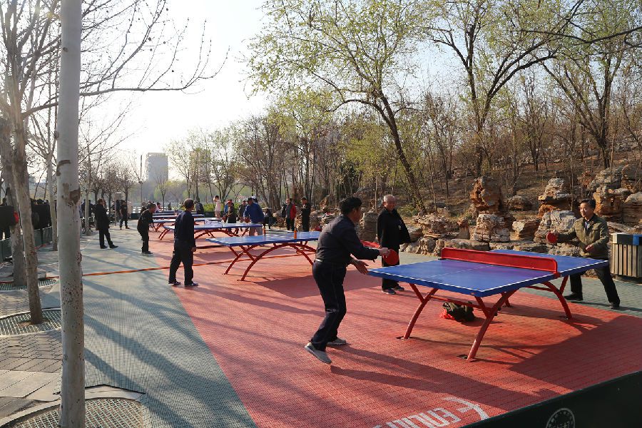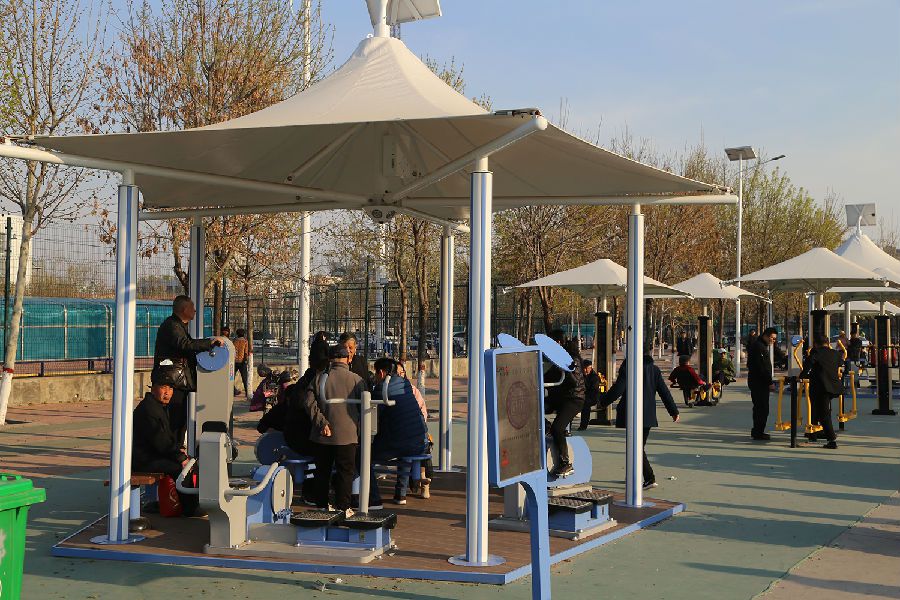 在人民公园里,各种智能健身区域划分的错落有致,1800米智能健身步道环湖而设,这些均已成公园的重要组成部分,市民们来此健身休闲下棋聊天已成常态。棋文化休闲区内安装有智慧棋苑和新型轨道棋牌桌,便利的太阳能供储电、能源转换、蓝牙控制等系统,为棋友们提供了一块老少皆宜的智力比拼场地;儿童游乐及体质拓展区配置了攀爬、秋千、滑梯等多项器材,助力发掘儿童的运动天赋,从而提高综合身体素质;老年及特殊人群健身区配置了平缓的有氧运动和力量运动器材,同时配备了适合残障人群康复和休闲健身的康复器材,满足特殊人群的健身需求;青年力量区配置了多个身体功能性力量型和拉伸型设施,实现了力量型健身由室内走向市外,有封闭走向开放。一位77岁的老人现场表演了单杠大回环,赢得了现场所有人的鼓掌叫好。此外公园里还设有武术训练休闲区、乒乓球训练区等多个健身区域,满足不同人群的休闲健身需求。这些健身区域的健身设施均像是一把伞的形状,所以市民们也称它们为“时尚小伞”,据悉,这些“时尚小伞”遍及沧州的每一个街边街角,形成一道特有的体育风景线,解决了市民健身到哪里去的问题。