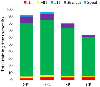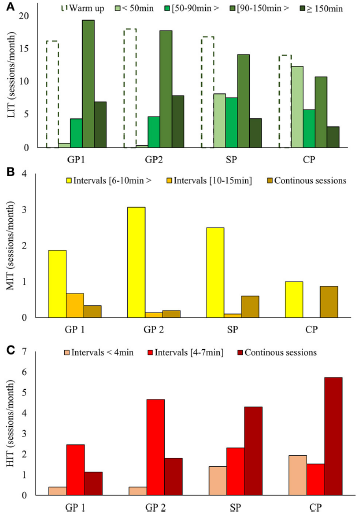 LIT的年训练量为784±10h。LIT的月训练量从GP阶段的76h,下降到SP阶段的68h,进一步下降到CP阶段的55h,但是LIT的课次在整个阶段中相对稳定,均为31.8±1.6次/月。因此,LIT课的平均持续时间从GP阶段的2.0h,下降到SP阶段的1.5h,再下降到CP阶段的1.3h。LIT课的持续时间分布为4%(<50min<>),10%(50–90min),42%(90–150>min)和23%(≧150min)。剩余21%的LIT时间为MIT、HIT或力量训练课中的热身或放松练习。各阶段中不同种类LIT课次的数量见图2A。