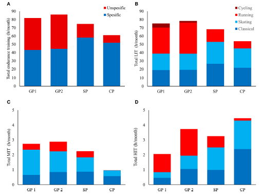 耐力训练和短距离冲刺训练每年约63±3%(545±18h)的训练量采用的是专项手段(即采用自由式和传统式技术进行滑雪或滑轮训练),剩余37 ± 2% (318 ± 18 h)的训练量采用的是非专项手段(34%的跑步和3%的自行车)。专项手段训练的比例从GP阶段的52%,增加到SP阶段的78%,再进一步增加到CP阶段的85%。专项训练的时间也从GP阶段的44h/月,增加到SP阶段的58 h/月,但是到CP阶段略下降至52h/月。专项训练分别占LIT、MIT和HIT年训练量的62,83和72%。图3A-D展示的是不同强度和训练阶段中运动手段的分布情况。传统式/自由式技术在总训练时间、LIT和HIT中的分布基本相同,分别为48%/52%、49%/51%和49%和51%,但是在MIT中,自由式技术训练的比例更高,达到了61%。