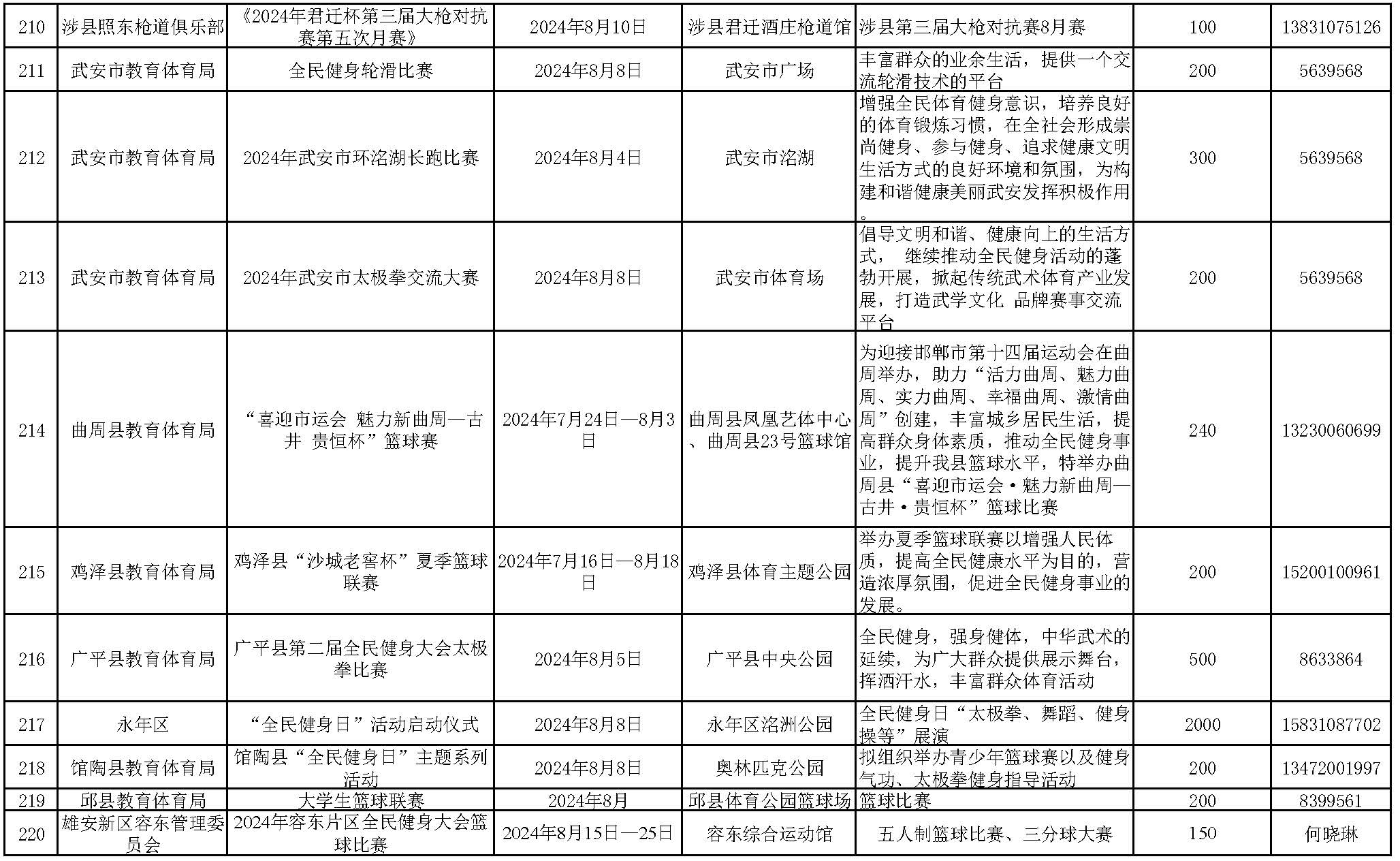 快来看!“全民健身日”期间全省各地将举办哪些主题活动? 来源:冀体融媒 时间:2024-08-06 今年8月8日是第16个“全民健身日”“全民健身日”期间全省各地举办形式多样的主题活动让我们一起来欣赏各地赛事活动的风采吧!2024年河北省“全民健身日”主题活动安排 责任编辑:吃瓜网