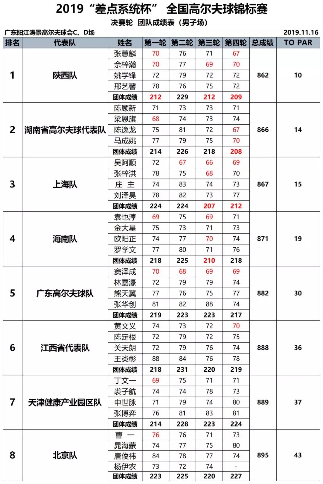 北京时间11月16日,2019“差点系统杯”全国高尔夫球锦标赛在阳江涛景高尔夫俱乐部结束第四轮较量,最终,陕西男队夺得男子团体第一名,广东女队无悬念夺得女子团体第一名。