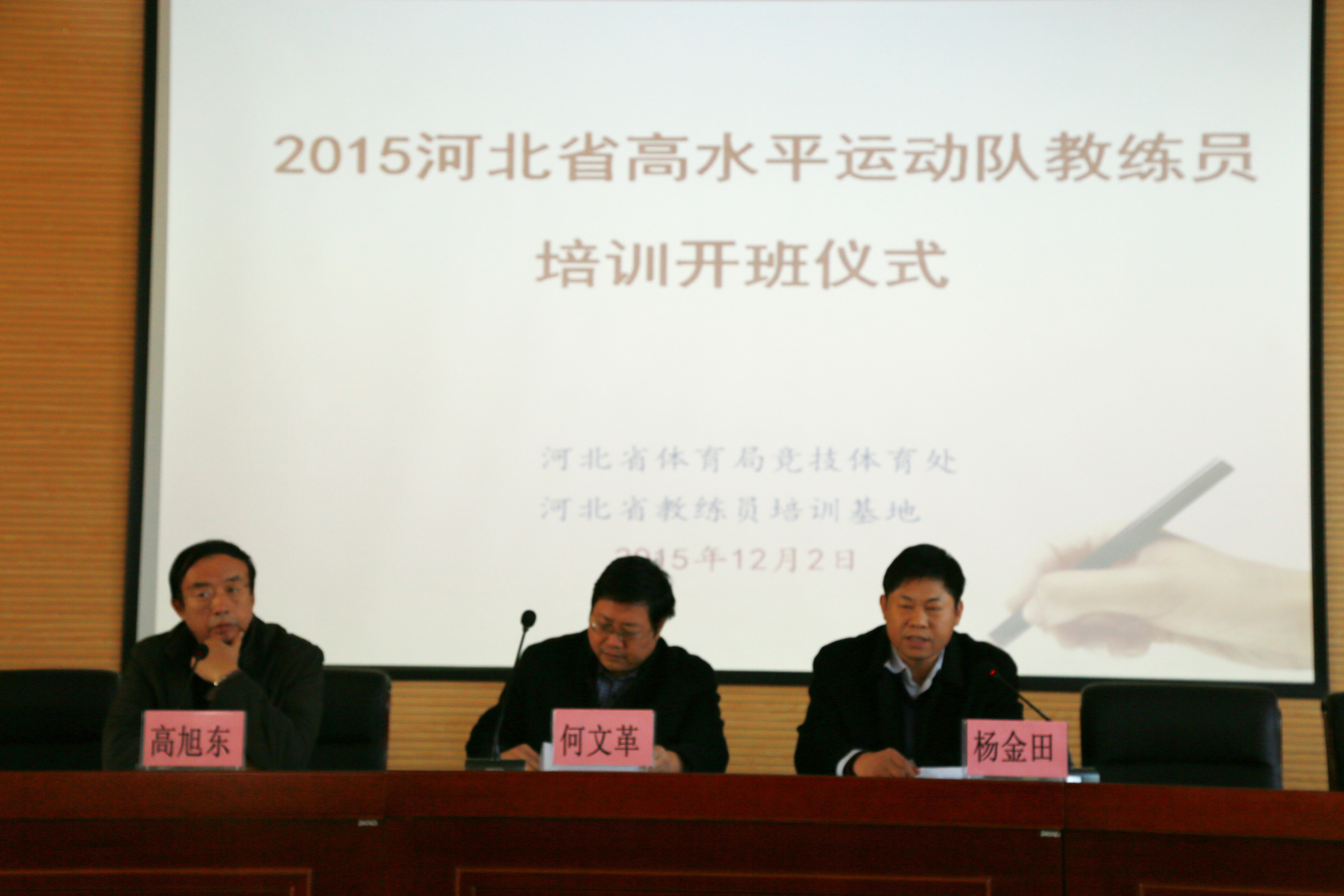 教练员学院成功举办,培训班旨在提高我省高水平运动队教练员执教水平,提高教练员综合素质和专项业务能力。何文革副局长在开班仪式上致辞并就如何当好一名教练员进行授课,河北体育学院副院长杨金田出席开班仪式并致欢迎辞,竞体处处长高旭东主持。