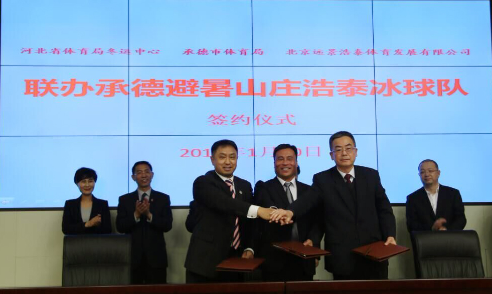 冬季运动管理中心主任刘晓马分别与承德市体育局党组书记李战争、北京远景浩泰体育发展有限公司董事长张远签订了省市企联办河北承德避暑山庄浩泰冰球队协议。