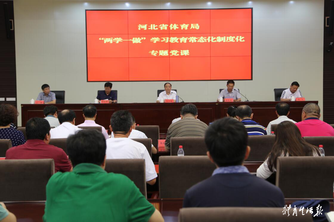 何江海强调,党建工作是一切工作的统领和基石,抓学习教育只有与中心工作深度融合、与正在做的事情有机衔接,才能收到好的效果。一是要始终保持绝对忠诚的政治品格。要用党章党规规范言行、用总书记系列重要讲话武装头脑,以实际行动践行好合格党员标准。一方面,要在“学”上深化拓展,在持续学、深入学上下功夫,把忠诚体现在学思践悟上。另一方面,要在“做”上深化拓展,在知行合一、学做相长上下功夫,把忠诚体现在干事创业上。二是要以更大的决心和力度深化体育改革。要在创新冰雪运动发展体制机制走在前,加快冰雪活动普及开展。要在改革创新全民健身多元供给机制上走在前,为群众提供更多更优质的公共体育服务。要在改革创新竞技体育发展体制机制上走在前,坚决打好竞技体育翻身仗。要在创新体育产业发展机制上走在前列,努力为群众提供多层次、高品质的供给服务。三是要大力营造风清气正的政治生态环境。注重发挥“关键少数”的示范带动作用,推动形成上行下效、整体联动的总体效应。抓好基层党支部相关制度的建设和落实,真正使党支部成为教育党员的学校、团结群众的核心、克难攻坚的堡垒。努力建设廉洁体育,抓好监督执纪问责,开展专项巡查,强化制度建设。树立鲜明的选人用人导向,推动形成能者上、庸者下、劣者汰的良好局面。四是要锤炼严细深实的工作作风。要以恪尽职守的强烈意识、勇于担当的胆略、干事创业的激情,自觉把个人抱负融入到火热实践中,努力推动各项工作提速增比进位。要坚持把学习作为修身之道,把实干作为立身之要,持续掀起“两学一做”学习教育的新高潮,进一步解放思想、改革创新,振奋精神、实干实政,奋力开创河北体育改革发展的新局面,以优异的成绩迎接党的十九大胜利召开。