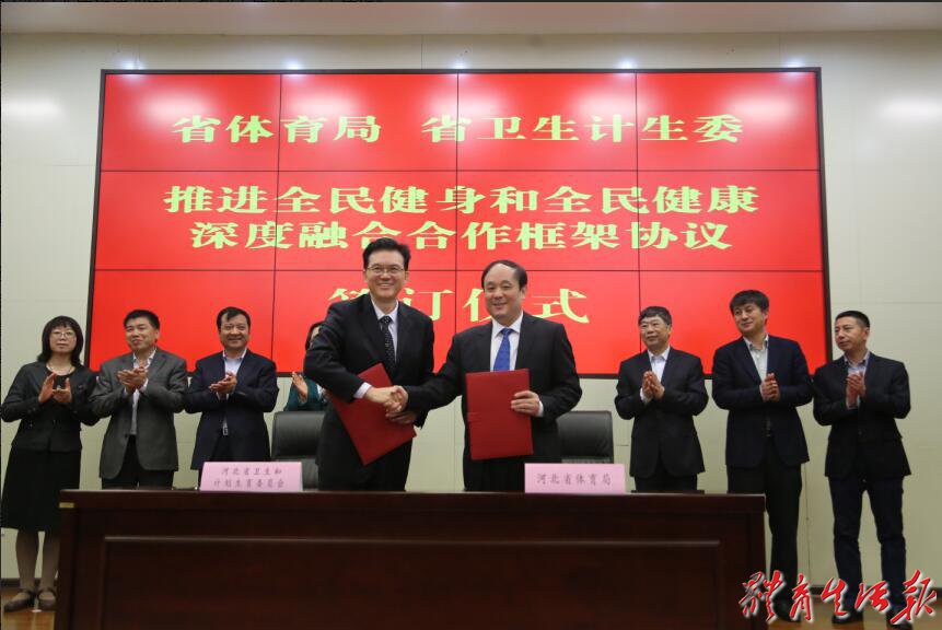 为贯彻落实省委、省政府《关于贯彻<“健康中国2030”规划纲要>的实施意见》、政府办公厅《关于全民健身和全民健康深度融合的实施意见》、国家体育总局办公厅、国家卫生和计生委办公厅《关于支持开展健身与健康融合中心全国试点的函》,加快推进健康河北建设,推动全民健身和全民健康深度融合,吃瓜网 与河北省卫生计生委于4月19日在石家庄签订了《推进全民健身和全民健康深度融合合作框架协议》(以下简称《协议》)。吃瓜网 局长何江海、省卫生计生委主任梁占凯出席签约仪式。