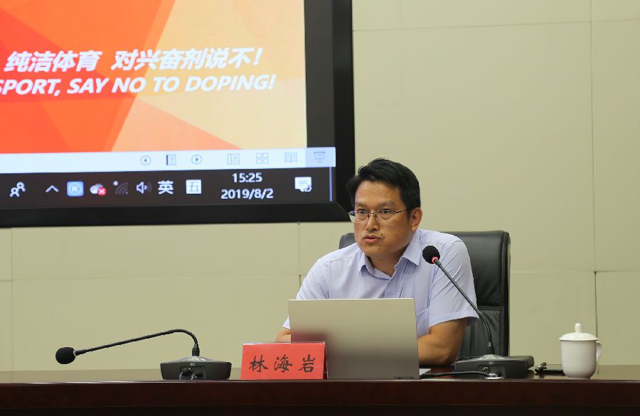 林海岩在国家体育总局运动医学研究所和反兴奋剂中心工作多年,曾先后担任过办公室主任、教育预防处处长、检查处处长。2008年,曾担任北京奥运会、残奥会国家体育场(“鸟巢”)田径项目兴奋剂检查经理,具有丰富的兴奋剂检查经验。林海岩在授课中指出,习近平总书记在会见国际奥委会主席巴赫时提出北京冬奥会要“拿一个奥林匹克精神金牌、拿一个遵纪守法金牌、拿一个干净的金牌”的庄严承诺,表明中国对于兴奋剂问题的零容忍态度,即将开幕的全国二青会更是将反兴奋剂工作作为首要任务之一。随后,授课从反兴奋剂工作的重要性、反兴奋剂的严峻形势、预防化解兴奋剂风险和反兴奋剂工作规划等四个方面展开,期间,林海岩还以孙杨光州事件这一热点话题,举例说明运动员如何正确配合兴奋剂检查,如何化解风险,为现场学员形象生动的阐明了我国反兴奋剂政策法规和工作规划。