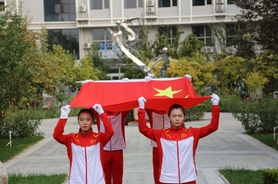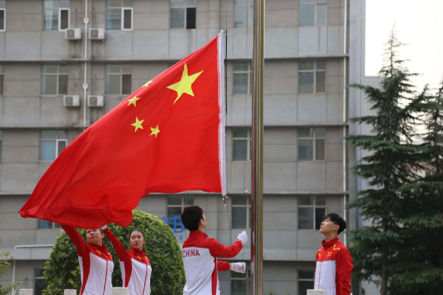 上午9时,升旗仪式正式开始。由四名运动员组成的国旗护卫队,迈着铿锵有力的步伐,护送着国旗正步走向升旗台,随着一声“升国旗、奏国歌”的口令,伴着激昂雄壮的国歌,鲜艳的五星红旗徐徐升起,在晨风中高高飘扬。