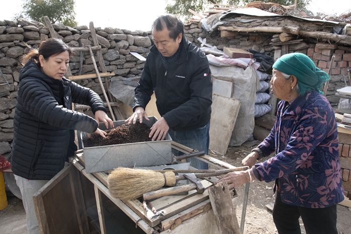 大球中心主任芦泉彬和副主任韩晖帮老乡晒荞麦皮
