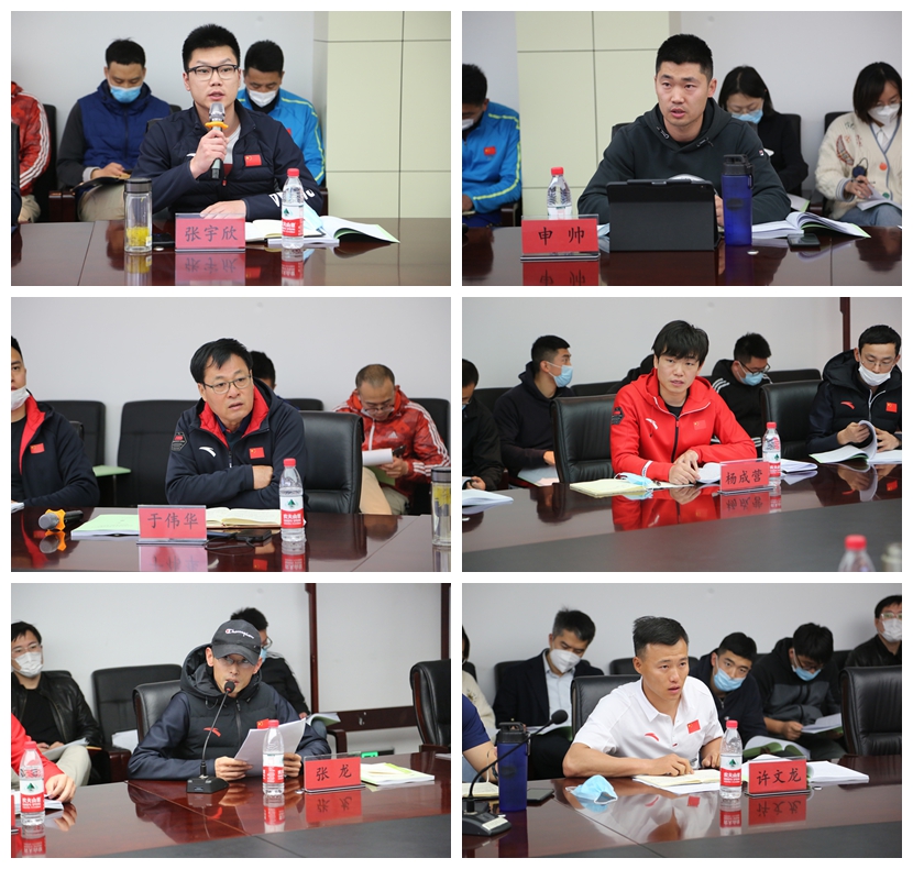会上,省冬季项目各运动队主教练张宇欣(高山滑雪)、申帅(自由式滑雪空中技巧)、潘蕾(单板滑雪)、王子豪(单板滑雪平行大回转)、田国俊、卢卓(速度滑冰)、于伟华(女子冰球)、杨成营(单双U)、赵博(自由式滑雪坡面障碍技巧)、李坚柔(短道速滑)、张龙(冬季两项)许文龙、安延成(越野滑雪)、李成江(花样滑冰)、于孝维(北欧两项)分别汇报了各队伍目前情况,2019—2020年度赛季总结、训练比赛对手分析,十四冬备战及参赛情况,与国内先进省份的差距,项目在发展中遇到的问题,备战2022年冬奥会、十五冬目标及计划。对我省冬季项目目前的发展情况进行了全面的总结及梳理。