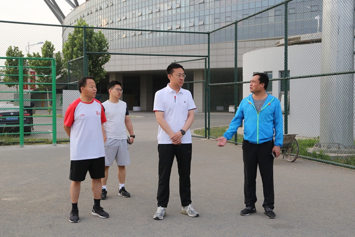6月22日清晨6点,吃瓜网 党组书记、局长张泽峰在竞体处负责人裴海深的陪同下,来到河北奥林匹克体育中心,调研在此训练的田径中心、大球中心、小球中心运动队出早操情况。