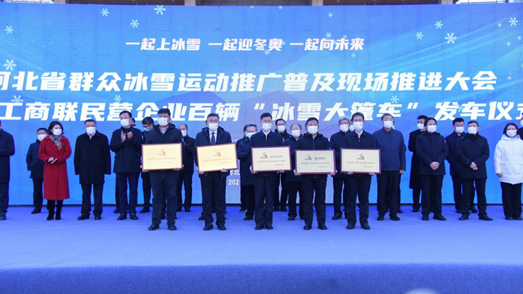 与会领导为全省基层群众冰雪运动示范单位代表、第三届冰雪运动会合作企业代表颁发牌匾,为中央驻冀媒体和省工商联民营企业百辆“冰雪大篷车”代表授旗,省政府副省长严鹏程宣布省工商联民营企业百辆“冰雪大篷车”发车,并同出席大会的领导嘉宾一起为发车仪式鸣响汽笛。承载着冰雪运动器材的一辆辆“冰雪大篷车”奔赴全省各地,助力推动全省群众冰雪运动高质量发展。
