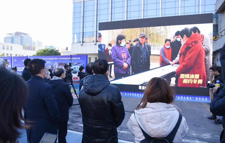 会前,参加活动的领导嘉宾一同观摩了省市县群众冰雪运动推广普及图片展、企业冰雪大篷车和企业参与冰雪运动推广普及展、冬奥知识展,展览以丰富多彩的形式,详实的数据和精美的图片展示了河北省推动冰雪运动向基层延伸,聚焦群众“家门口”,广泛开展社区冰雪运动会、乡村“冰雪大篷车”体验和校园冰雪季等活动成果。随后到场领导嘉宾一同观看了石家庄市小学生“一起上冰雪、一起迎冬奥、一起向未来”冰雪长卷创作过程,在雪如意模型上,小学生们用童真而稚拙的画笔、绚丽多姿的色彩,描绘着他们心中对北京冬奥会的憧憬。启动仪式前,现场播放了“激情冰雪·相约冬奥”河北省基层群众冰雪运动专题片,并通过现场与社区冰雪运动会、“冰雪大篷车”体验活动、企业门店冰雪运动体验区进行了视频连线,展现了全省人民群众为迎接2022北京冬奥会,以饱满激情和实际行动积极参与丰富多彩的冰雪运动。