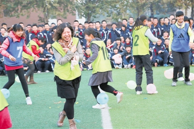 而在学生比赛的间歇,各班班主任也热身入场,与同事火热PK起来。老师们跳绳、赛跑时的英姿固然赢得学生们一阵阵叫好声,而他们在踩气球大赛中所犯的失误以及露出的窘态,更是让在场学生哄然大笑。一项项比赛在紧张进行着,师生之间的距离也悄然拉近了。