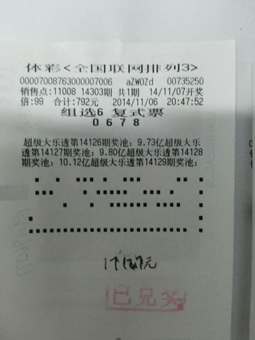 你们相信吗?小玩法,同样能成就大梦想!体彩排列三作为一种小盘玩法,技术分析显得更为重要。11月10日一大早,一位中年男子来到邢台市体彩中心,在工作人员询问时,他掏出21张彩票称要兑奖。当中心工作人员接过他的中奖彩票看过后,不禁赞叹:“您这‘组选小复式’号瞅得真准呀!”。此票为组选6复式(0 6 7 8),倍投99倍。