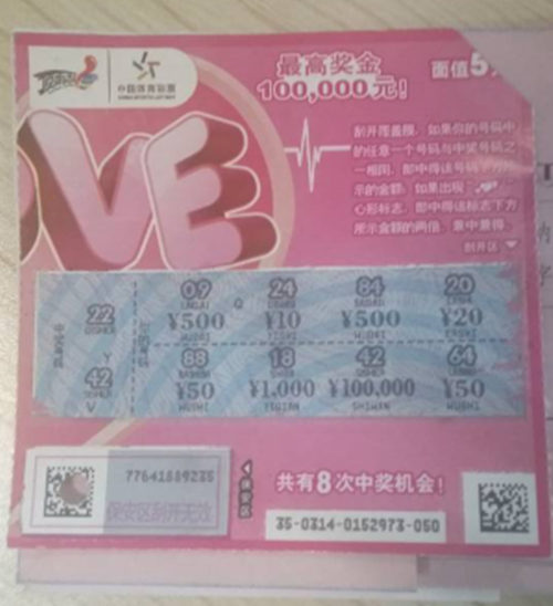 体育彩票“顶呱刮”“love”,自上市以来就凭借其富有创意的两张拼凑起来的“love”和充满爱意的票面,受到了彩民朋友的喜爱,“love”的高中奖率也让彩民爱不释手。销售网点不仅百元、千元奖项频出,近期更有一位幸运彩民喜中“LOVE”头奖,奖金高达十万元。