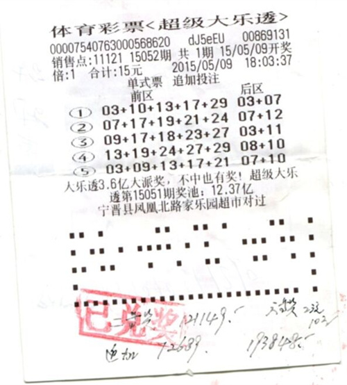 5月9日开奖的第15052期超级大乐透,邢台宁晋彩民幸运的喜中大乐透二等奖追加一注,奖金193838元。