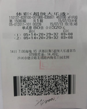 2015年7月13日,沙河中出七星彩一等奖。就在第二天沙河12011投注站也传出喜获大乐透三等奖160倍的喜讯,中奖金额达24万元。这张三等奖中奖票为单式倍投票,很可惜,只差一号,错失了掏空大乐透奖池的良机。