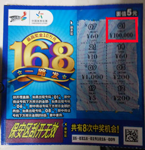 邯郸彩民中顶呱刮新票“168”头等大奖