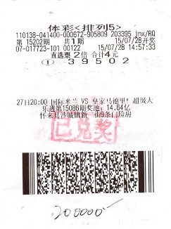 张家口怀来县彩民喜中2015年7月28日开奖的体育彩票排列5第15202期两注,共计20万元大奖!