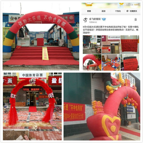 活动开始后第一个开奖日,邢台所有体彩站点在店外支起拱门、铺上红地毯、播放大乐透促销音频,店内准备了水果、瓜子等零食。专管员、业主、销售员利用新媒体宣传造势,全市所有体彩销售网点同时开启促销活动启动仪式,热闹喜庆的启动仪式,为本次促销活动营造了更加良好的宣传氛围,势必进一步扩大体彩超级大乐透的宣传效果,使邢台体彩站点又一次成为牛城彩民争相前往的聚集地。