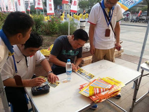 8月8日早上6点,廊坊中心的员工就早早的搭好了即开户外销售篷,将本次乐透的活动海报张贴在帐篷的周边,进行宣传。彩票站的业主们也非常的积极配合此次活动,有组织有纪律的骑着绑有体育彩票旗帜的电动车来到现场,并在现场分发自己为此次乐透活动印制的传单。活动现场,许多提前到场的市民也被“顶呱刮”彩票吸引着,纷纷过来询问,如何进行购买。市民们一边享受着全民健身带来的健康和快乐,一边享受着即开型彩票为他们带来的激情和中奖后的喜悦。