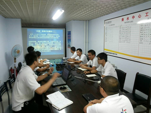 针对今年8月12日发生的陕西商洛山阳县山体滑坡灾害和天津滨海新区危险品仓库爆炸事故,衡水中心迅速排查安全隐患,对办公区域、库房、值班室以及车辆逐一排查,确保各项工作安全运行。8月18日,衡水中心全体员工开展安全生产工作会,借此提高员工的安全生产意识和应急处理能力。