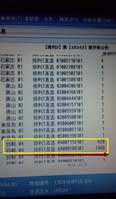 2015年9月7日晚,对于河北体彩彩民来说是一个值得纪念的日子,在这一天的体彩各玩法开奖结果,河北三个地市同时中出超级大乐透一等奖!邯郸虽然未能中出大乐透一等奖,但邯郸“牛人”彩民当天第 2015243 期排列3玩法,中出620注和2488注一等奖,奖金分别为644800元和2587520元,共计3232320元,破近年河北排列3中奖纪录!