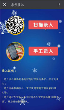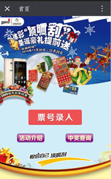 微信录入步骤:进入“体彩顶呱刮”微信——点击菜单中的“圣诞豪礼”——进入“票号录入”页面录入即可。(选择微信录入的朋友,不需输入手机号,关注微信时系统已经收录过你的号码啦!)