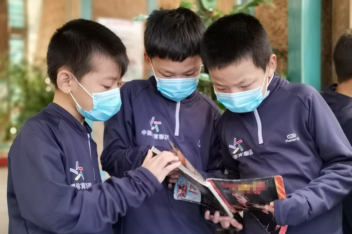图为第五届公益体彩少年足球训练营的孩子们在石家庄呈明书店认真阅读