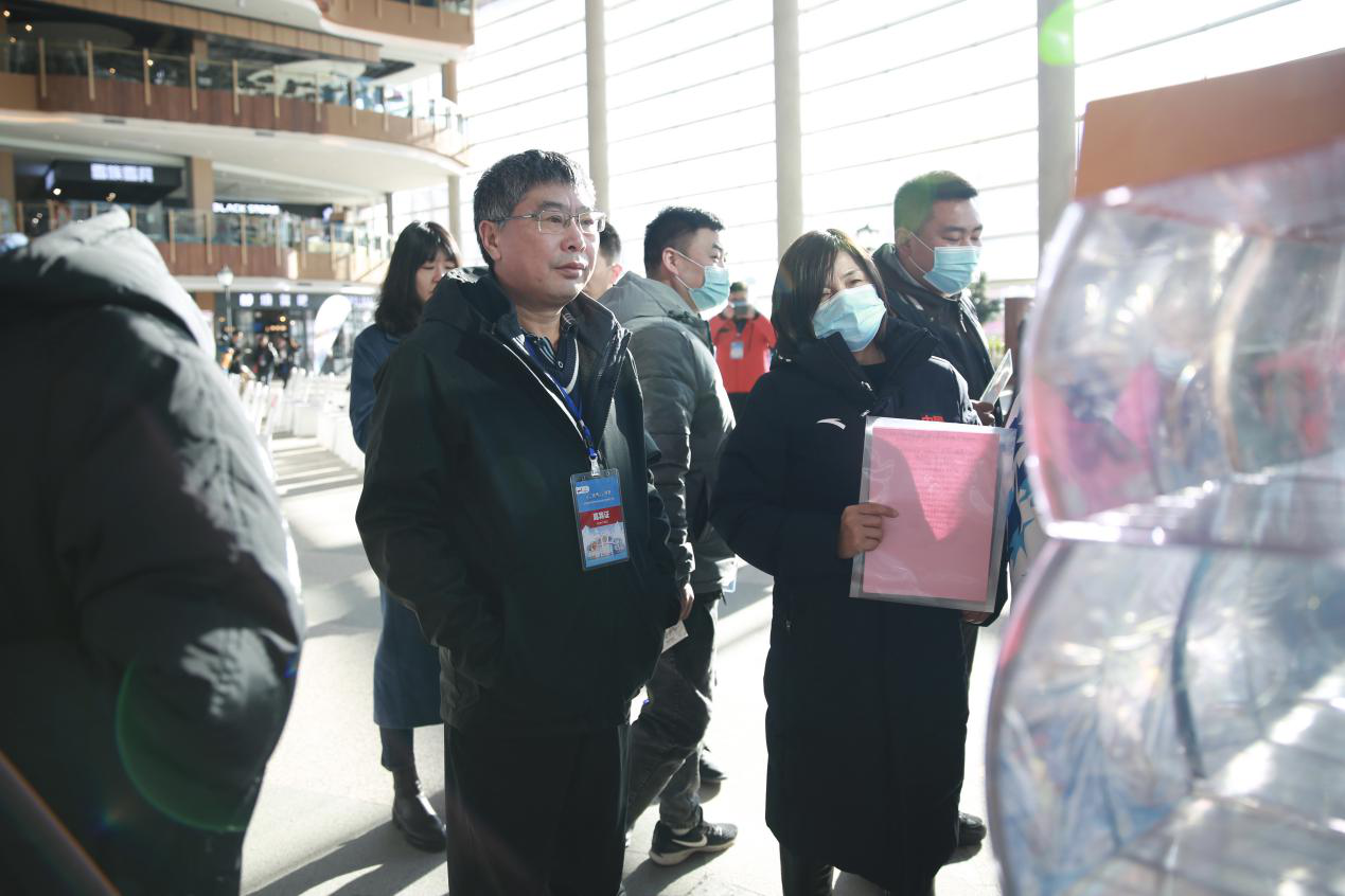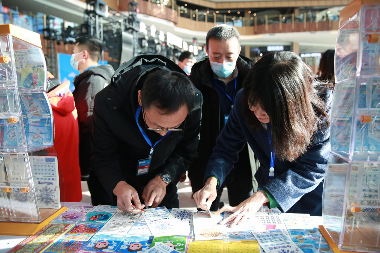 图为河北省体育彩票管理中心主任高东勋、副主任方晓现场体验“爱赢爱冰雪”即开票