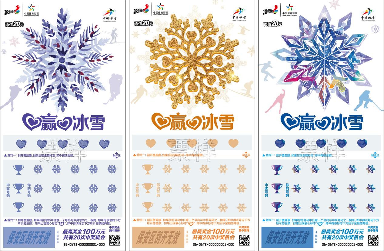 20元面值的“爱赢爱冰雪”即开彩票,共三个场景,采用镭射纸印刷工艺,以艺术化的雪花为票面主形象,向购彩人群宣传推广冰雪运动。该款票种有20次中奖机会,中奖率较高,奖级侧重中小奖,最高奖金100万元。