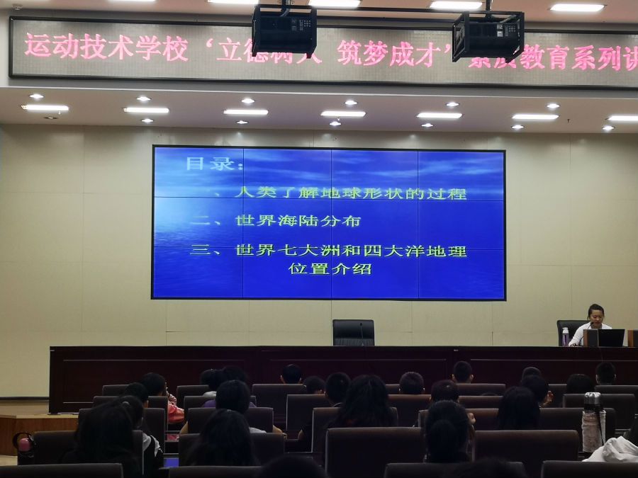 10月8日,运动技术学校“立德树人 筑梦成才”素质教育系列讲座举办第9场讲座,学校教师李莎以“世界海陆地理概况”为主题作了讲座。150余名学生聆听了讲座。