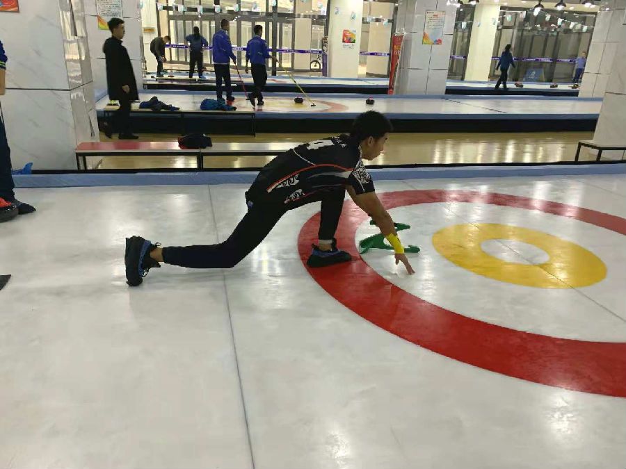 青年组选手在陆地冰壶竞技道上进行比赛