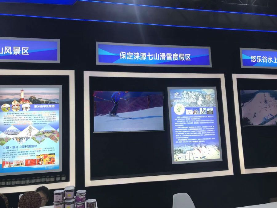 进入展厅,深蓝色、白色的主色调,营造出了浓浓的冰雪氛围,与此次河北参展主题非常契合。参展的10个产品,保定涞源七山滑雪度假区、悠乐谷滑雪场、中新健康城-国家登山训练基地等,充分展示了河北省丰富的冰雪资源,秦皇岛首钢赛车谷、无极山体育旅游产业示范区等,则展示了我省丰富的体育旅游资源,通过文字、图片、视频等方式,让观众对我省体育文化、体育旅游产业有了更深入了解。