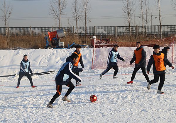 雪地足球赛的激烈程度丝毫不亚于雪球赛