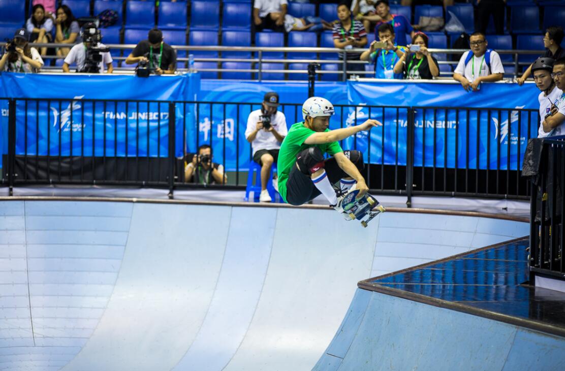 滑板是本届全运会群众比赛项目,分为男、女街式和男、女碗池。男子碗池项目共有16名选手进入决赛,河北省选手邢岩第14个出场。作为河北省唯一一个参加滑板碗池决赛的选手,绰号“老鹰”的邢岩一出场就以流畅优美的滑行惊艳全场,第一轮就以52.83的高分遥遥领先,这也为他后几轮的完美发挥打下了基础。最后一轮比赛中,邢岩以“单手倒立360度”的高难度动作,获得53.17分,夺得桂冠。