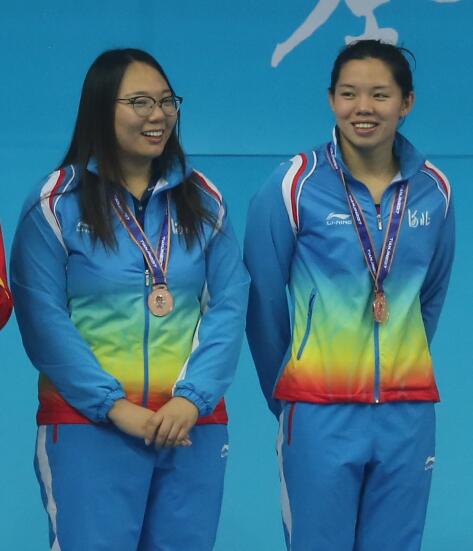 教练肖茜(左)、周羿霖登上领奖台