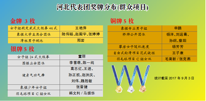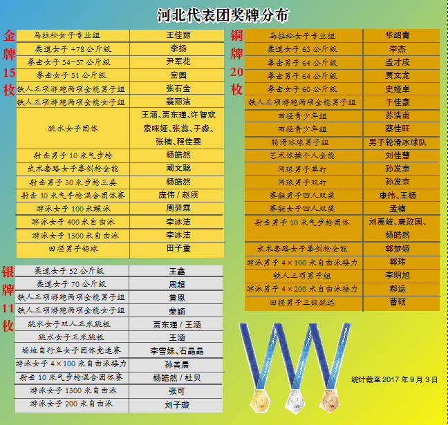 截止到9月3日第十三届全运会河北代表团奖牌分布表