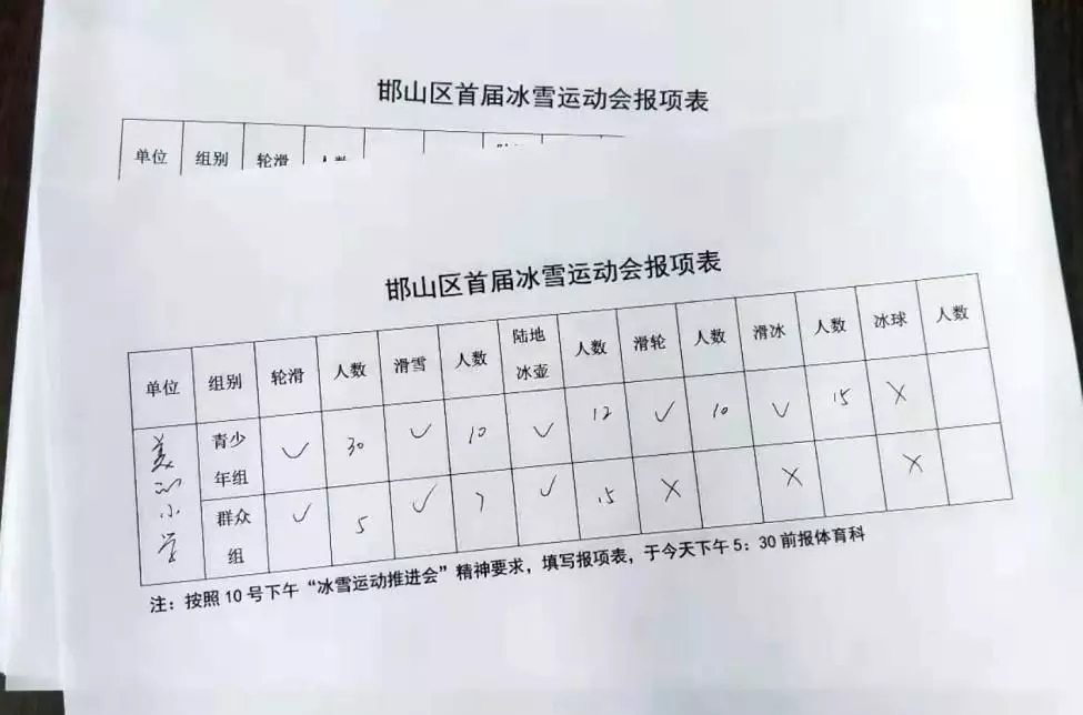 1、调查摸底,确定人才是关键。面向各党政机关、企事业单位、村(居)、学校广纳人才,通过实地走访、填写《冰雪运动报项表》等方式,对冰雪运动人才广泛调查摸底,充实到《邯山区冰雪人才信息库》,并重点对轮滑、滑雪、陆地冰壶、滑轮、滑冰、冰球人才进行统计,掌握其热衷于冰雪运动的具体项目和获得的主要成绩。经统计,该区800余位具有滑雪、陆地冰壶等项目特长的专业人才成为冰雪运动发展的“生力军”。
