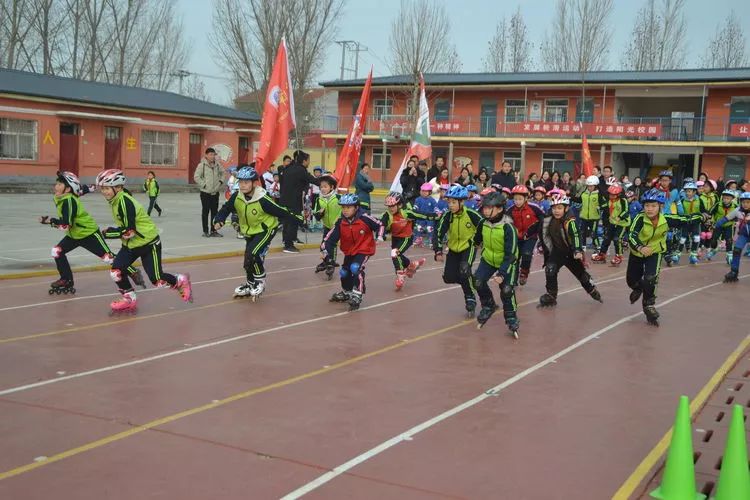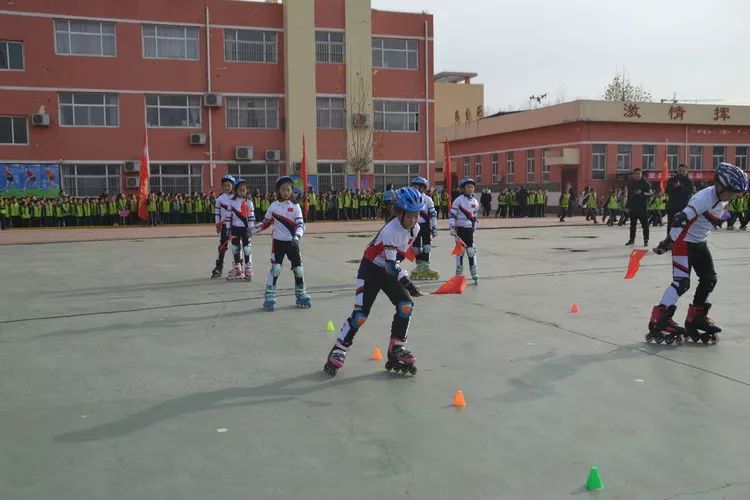 活动中,跟随着欢快的运动音乐,同学们在操场上进行了团体轮滑、团体接力自由过桩轮滑、陆地冰壶等项目的表演。