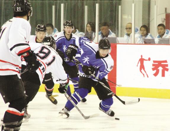 在第十三届全国冬季运动会上,我省男子冰球队(蓝)摘得铜牌。